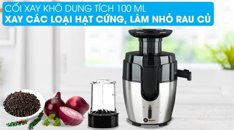 Đi kèm sản phẩm là cối xay sinh tố chất liệu thủy tinh dung tích 600 ml và một cối xay khô bằng nhựa PP dung tích 100 ml, tăng thêm chức năng của chiếc máy ép trái cây.