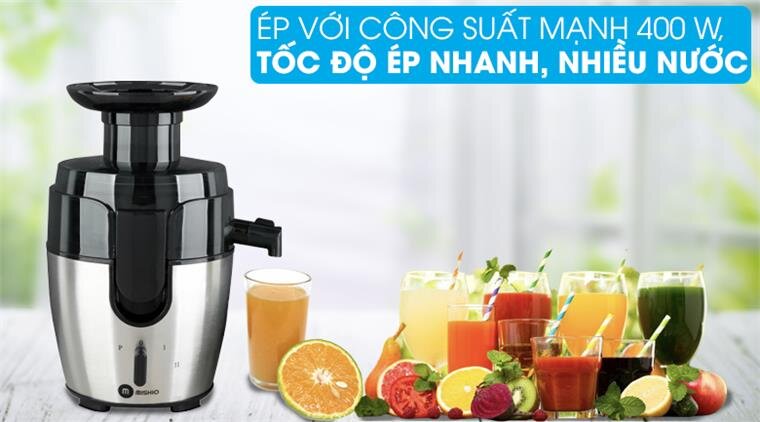 Máy ép trái cây Mishio MK-197 hoạt động với công suất mạnh 400W, cho tốc độ ép nhanh, nhiều nước, tiết kiệm điện năng. Cối ép làm bằng nhựa PP, dẻo, dung tích chứa được lượng nước ép lên đến 800 ml. Chất liệu nhựa PP, có khả năng chịu lực chịu va đập cao, hạn chế bị nứt vỡ, an toàn khi tiếp xúc với thực phẩm, không sản sinh độc tố gây bệnh. Tuy nhiên về mặt thẩm mỹ sẽ kém hơn so với cối xay bằng thủy tinh.
