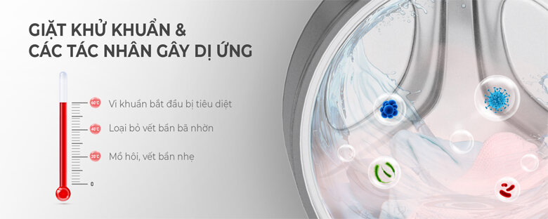 Với chức năng Steam Wash, nước trong máy sẽ được làm nóng đến 70 độ trong 25 phút đầu tiên. Điều này sẽ làm cho máy thoát hơi nước vào từng sợi vải, loại bỏ dầu mỡ, chất gây dị ứng và mùi hôi trên quần áo một cách hiệu quả. hiệu quả. Đồng thời, tính năng này giúp loại bỏ vi khuẩn có thể bám vào quần áo hoặc lồng giặt, đây là điều mà nhiều máy giặt không làm được.