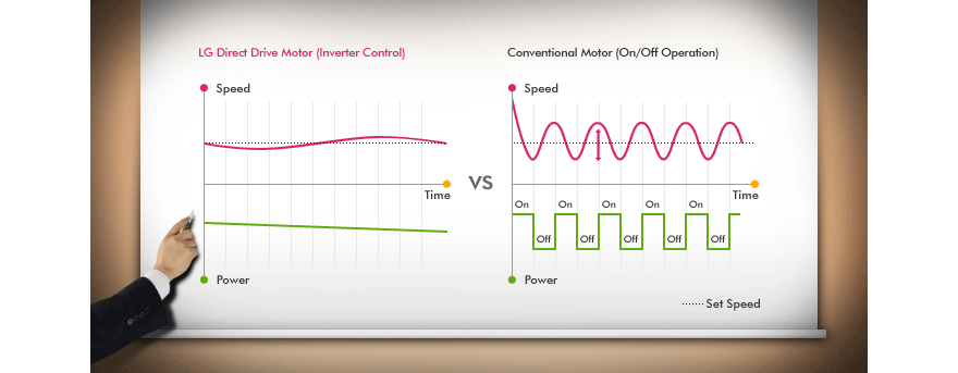 Động cơ dẫn động trực tiếp biến tần của LG bền bỉ & đáng tin cậy hơn bởi đã loại bỏ bớt chi tiết so với máy giặt thông thường.