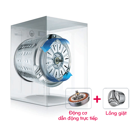 ĐỘNG CƠ DẪN ĐỘNG TRỰC TIẾP Động cơ dẫn động trực tiếp bền bỉ & mạnh mẽ hơn. - Khác với động cơ thường với chổi than và dây cu-roa, động cơ dẫn động trực tiếp của LG được gắn trưc tiếp vào lồng giặt. - Tiết kiệm điện & nước, tăng độ bền của động cơ và giảm chi phí bảo trì. - Giảm thiểu độ rung và tiếng ồn do ít bộ phận chuyển động hơn.