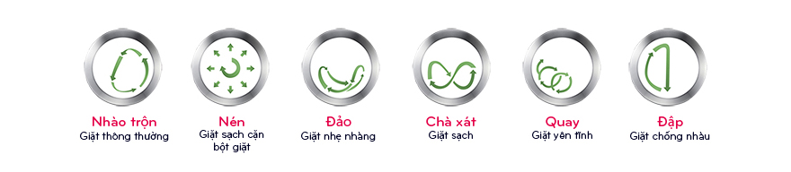 Động cơ dẫn động trực tiếp & 6 chuyển động giặt mang tới các bước giặt tối ưu, nhẹ nhàng chăm sóc sợi vải. 6 motionDD vừa giặt hiệu quả, vừa chăm sóc sợi vải bằng khả năng điều khiển công suất & chuyển động giặt để phù hợp với từng loại vải. Công nghệ giặt mới nhất của LG cho phép máy giặt chăm sóc quần áo như đôi tay của bạn với 6 bước giặt: Chà xát - Quay - Nhào trộn - Đảo - Nén - Đập. 6 motions là sự cải tiến trong chu trình giặt, mô phỏng các bước giặt tay của con người (đập, vò,...). Các máy giặt thông thường chỉ thực hiện 1 chuyển động duy nhất trong suốt cả chu trình giặt, còn máy giặt 6 motion thực hiện 5-6 chuyển động giặt trong 1 chu trình (tùy chương trình giặt).