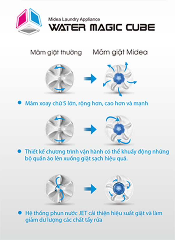 Nhờ thiết kế đặc biệt của 2 mâm giặt xoáy kép, máy giặt cửa trên Midea giúp tạo ra các luồng nước xoáy mạnh mẽ, giúp đánh tan các vết bẩn cứng đầu một cách dễ dàng.