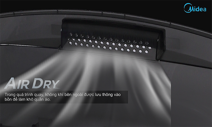 Quần áo sẽ khô nhanh hơn nhờ vòa chức năng Air Dry, trong quá trình quay, không khí bên ngoài sẽ được lưu thông vào bồn để làm khô quần áo.