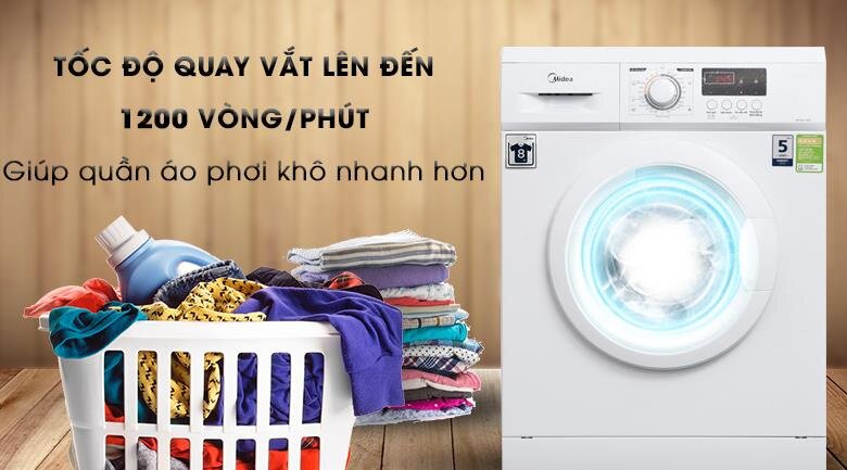 Máy giặt Midea này có tốc độ quay vắt lên đến 1200 vòng/phút. Nhờ đó, quần áo sẽ được giặt sạch hiệu quả hơn, đồng thời, nhanh chóng, tiết kiệm thời gian phơi, rất tiện dụng cho những ngày mưa hoặc thời tiết ẩm ướt.