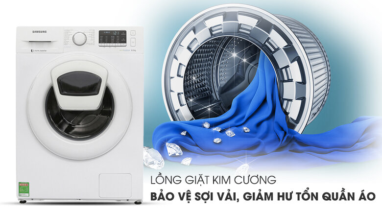 Máy giặt Samsung AddWash Inverter WW80K52E0WW/SV - 8 kg, Lồng ngang với thiết kế lồng giặt chạm nổi dạng kim cương giúp làm sạch hiệu quả nhưng vẫn nhẹ nhàng chăm sóc từng sợi vải. Những lỗ thoát nước mang hình kim cương trên lồng giặt, giúp quần áo di chuyển nhẹ nhàng, đồng thời các lỗ thoát nước nhỏ hơn sẽ giúp bảo vệ sợi vải không bị vướng gây hư hỏng quần áo.