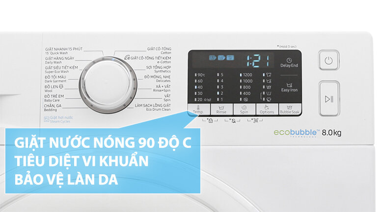Chiếc máy giặt Samsung này được trang bị công nghệ giặt nước nóng lên đến 90 độ C giúp diệt khuẩn, các tác nhân gây dị ứng trong quần áo và làm mềm sợi vải. Hãy bảo vệ tốt nhất cho làn da nhạy cảm của trẻ nhỏ bằng tính năng giặt nước nóng này nhé.