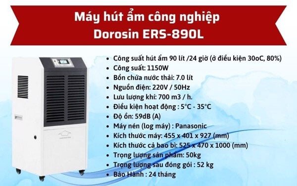 có công suất hút ẩm đạt 90 lít/ngày ở nhiệt độ 30 độ C và độ ẩm 80% giúp xử lý ẩm hiệu quả và phù hợp cho các kho hàng có diện tích từ 110m2 - 150m2.