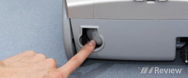 Phía dưới thân sau của máy gồm có ổ cuộn dây điện tự động (phải) và ổ cắm ống thổi bụi
