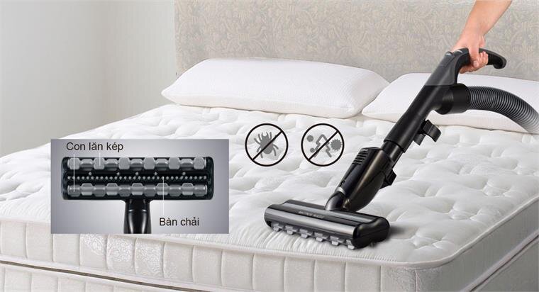 Đầu hút đệm với bánh lăn kép kháng khuẩn và bàn chải đánh bật bụi bẩn, mạt bụi và chất gây dị ứng ẩn sâu bên trong đệm.
