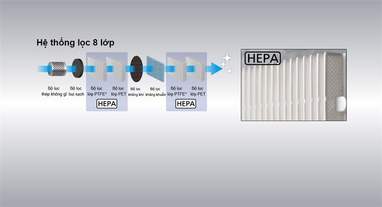 Khí xả sạch do qua hệ thống lọc 8 lớp, bao gồm bộ lọc thép không gỉ, bộ lọc HEPA kép & bộ lọc kháng khuẩn, hấp thu các chất gây dị ứng không nhìn thấy như bụi, mạt, phấn hoa và vi hạt.