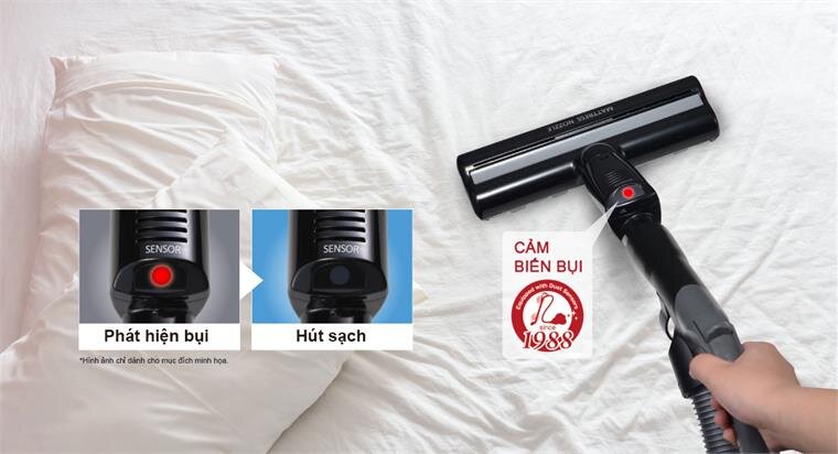 Cảm biến bụi (có thể phát hiện hạt bụi có đường kính nhỏ hơn 70 μm) mang lại hiệu suất làm sạch hiệu quả hơn trên nệm. Đèn phát sáng màu đỏ nghĩa là vẫn phát hiện thấy bụi; đèn tắt có nghĩa là chăn mền đã sạch.
