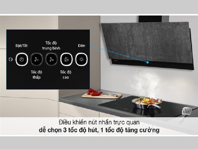 Máy có một bảng điều khiển nút đơn giản, và ba cài đặt hút thông thường và một tốc độ hút turbo đều có thể dễ dàng truy cập. Loại bỏ khói và mùi khó chịu khỏi căn bếp nhà bạn một cách nhanh chóng. Nếu có nhiều khói hoặc mùi, bạn có thể loại bỏ nhanh chóng bằng chế độ hút tăng cường của máy.