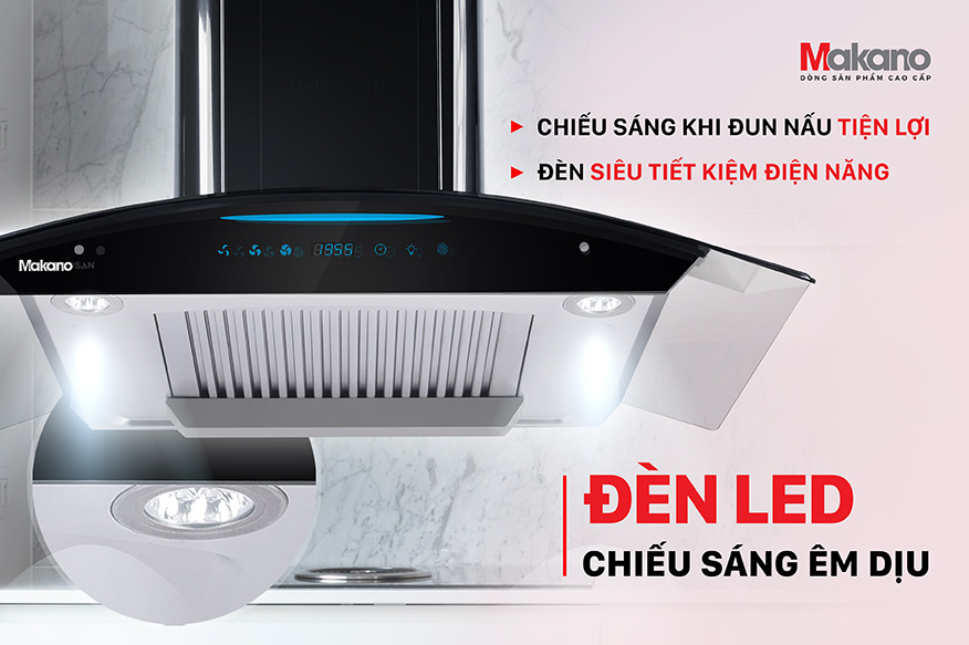 Máy hút mùi trang bị đèn Led chiếu sáng, dễ quan sát món ăn trong khi nấu