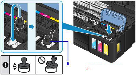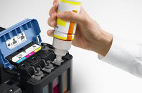 Bước 5: Rót mực vào bình mực theo thứ tự các màu, dựng đứng chai và bóp nhẹ nhàng cho đến khi hết mực trong bình theo như hình vẽ.