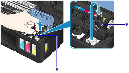 Bước 2: Mở nút cao su màu đen trên hộp mực theo như hình vẽ E, F
