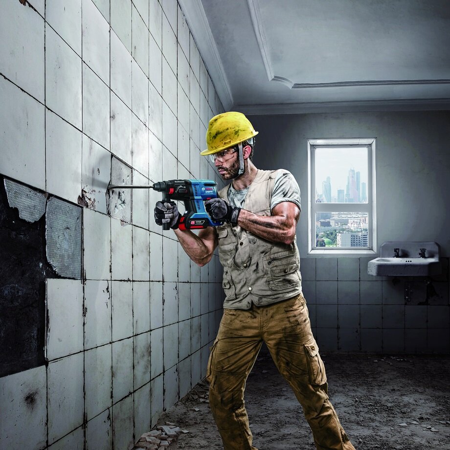 - Bên cạnh đó, điện thế pin 18V là điểm minh chứng tiếp theo cho khả năng hoạt động mạnh mẽ của máy khoan, vì điện thế càng cao, trên mức 14V thì càng phù hợp với những công việc nặng như khoan sắt, kim loại, bê tông, gạch men, cụ thể là khả năng khoan thép với đường kính 13mm, gỗ 30mm. Tiện dụng hơn, máy còn có thể hỗ trợ bạn trong các công việc bắt vít khi bạn quên mang theo công cụ bắt vít. - Ngoài ra, máy Bosch GBH 180-Li còn vô cùng tiện lợi khi sử dụng pin 180-Li với hiệu suất làm việc bền bỉ suốt 10 giờ đồng hồ, giúp cho công việc không bị gián đoạn và không bị phụ thuộc vào nguồn điện. Trọng lượng pin nhẹ cũng là yếu tố góp phần giúp trọng lượng máy trở nên nhẹ hơn, giảm thiếu áp lực cầm nắm khi sửa chữ trong khoảng thời gian dài.