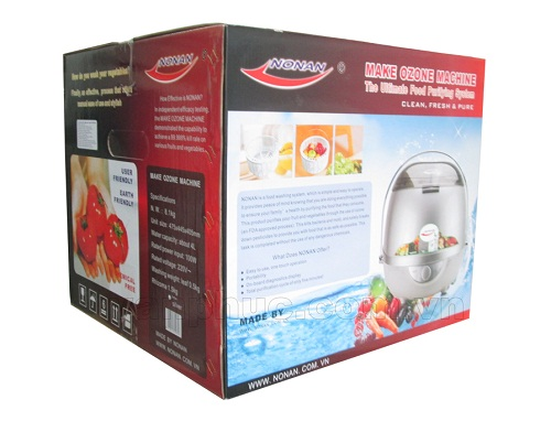 Quy cách đóng gói máy khử độc rau quả Nonan KD07 Thứ hai: Máy khử độc rau quả có tác dụng rất lớn trong việc khử độc, khử khuẩn ...nhưng nó không phải là một loại máy thần kỳ. Nó chỉ có thể khử độc và khử khuẩn được đến nơi nao mà Ozon có xâm nhập được. Thứ Ba: Về kinh nghiệm sử dụng. Quý khách nên sử dụng hết chương trình chạy của máy. Khi máy đã chạy xong hết chương trình rửa quý khách nên mở cửa của máy ra và đợi khoảng 4-5 phút sau đó mới nên lấy thực phẩm ra để cho lượng Ozon có thể thoát ra ngoài và phân rã thành oxy hết. Nên ít tiếp xúc thường xuyên với nước có nồng độ Ozon quá đậm đặc, không nên dùng mũi ngửi trực tiếp khí Ozon vì tính khử của Ozon khá mạnh.