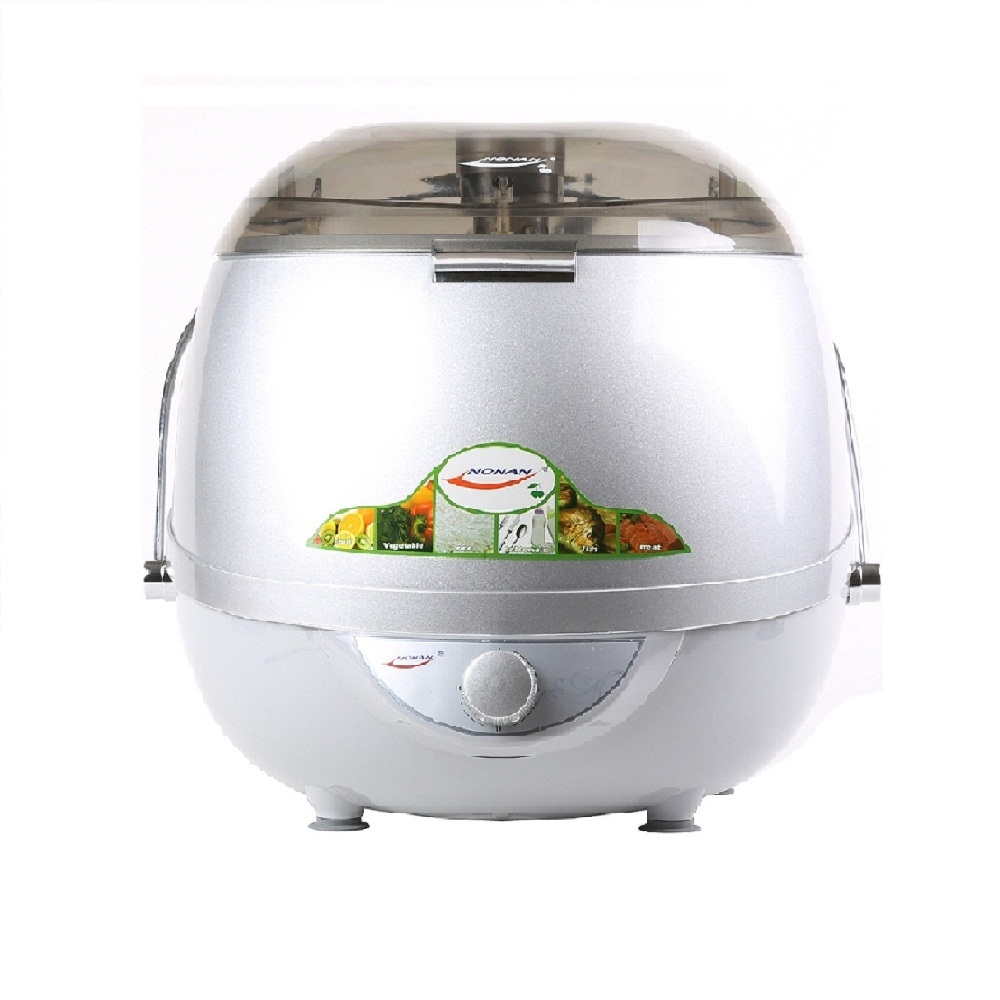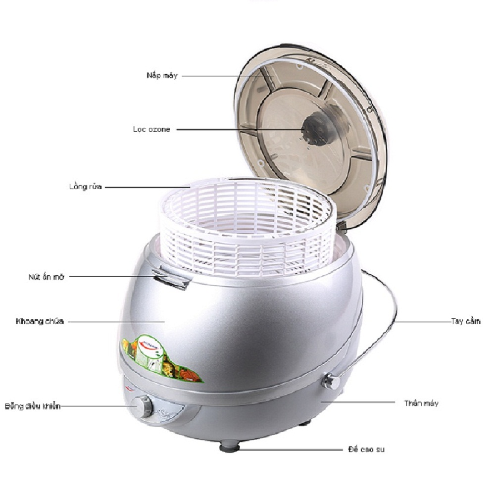 Nonan KD07-Người bạn tin cậy của các bà nội trợ 4- Làm sạch nước uống: Ozone có khả năng ôxi hóa các tạp chất độc hại trong nước làm cho nước uống trong suốt, phân giải ion kim loại nặng trong nước làm cho nước tinh khiết gần như tuyệt đối. 5- Điều quan trọng nhất đối với máy khử độc Nonan là không dùng thêm bất kỳ hóa chất nào, làm bạn hoàn toàn yên tâm khi ăn uống. Máy khử độc rau quả Nonan KD07- Cấu tạo và nguyên lý hoạt động Nonan KD07 được thiết kế dạng nồi kín với vỏ bằng nhựa 2 lớp dày rất bền. Bên trong là hệ thống tạo Ozon và moto làm xoay lồng đựng thực phẩm trong quá trình rửa. Lồng đựng thực phẩm có thể xách ra ngoài một cách dễ dàng. Điều khiển cơ dễ dàng sử dụng. Nắp máy thiết kế chống trào và có bộ phận lọc khí bằng than hoạt tính ở phía trên của nắp.