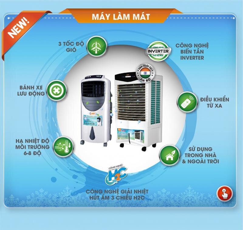 Máy làm mát không khí Comet hoạt động theo nguyên lý tự nhiên không thải CFC, làm mát không khí thông minh bằng sự trao đổi nhiệt dựa vào hiện tượng bốc hơi nước, bằng cách dùng tấm làm mát hạ nhiệt độ nước để làm mát không khí, vượt trội về công nghệ làm mát, không gây khô da ngạt mũi, đặt biệt tiết kiệm chị phí.