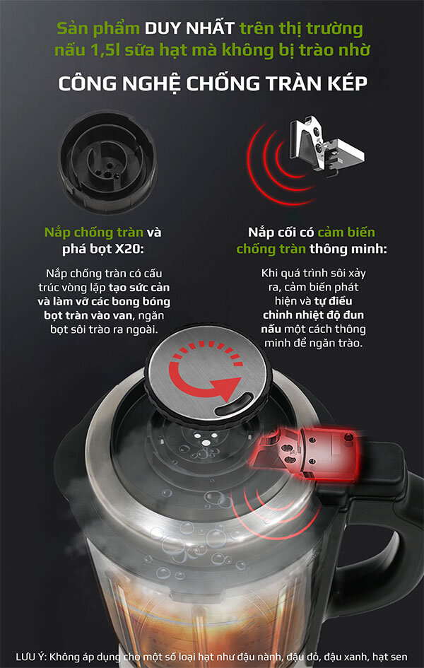 Ngoài ra máy còn được công nghệ đun nấu hiện đại chống trào ra ngoài đảm bảo an toàn trong suốt quá trình xay nấu