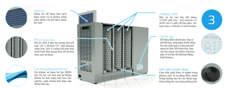 Air Sniper là thiết bị máy lọc khí công nghiệp đầu tiên ứng dụng công nghệ diệt khuẩn làm sạch không khí tiên tiến nhất hiện nay, sử dụng bức xạ tia cực tím có bước sóng an toàn cho con người và tầng khí quyển cùng với bộ lọc gồm 4 tấm quang hóa làm tăng hiệu quả oxy hóa bề mặt, tối ưu hiệu quả diệt khuẩn làm sạch không khí.