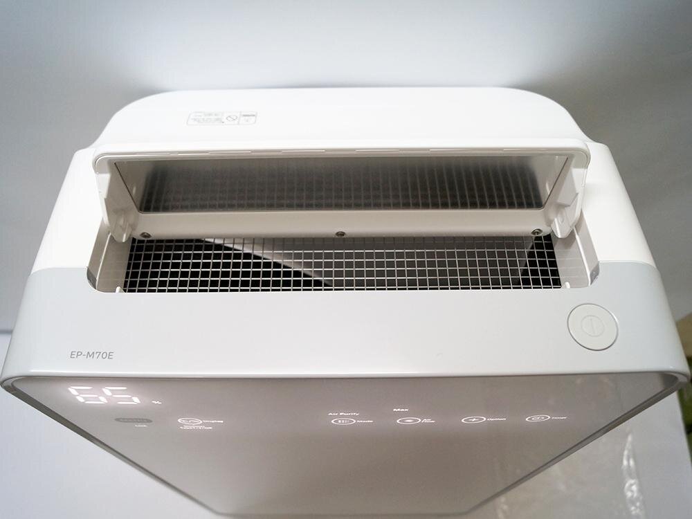 Máy lọc không khí kết hợp tạo ẩm Hitachi EP-M70E thiết kế thon gọn nhẹ với màu sắc trắng trang nhã mặt kính cường lực sẽ tạo vẻ bên ngoài lịch làm cho căn phòng