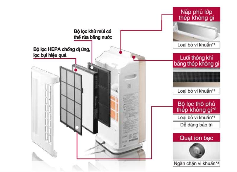 Máy lọc không khí được trang bị 3 bộ lọc chuyên dụng gồm: , màng lọc Carbon, màng lọc bụi, giúp loại bỏ được 99,9% những tạp chất có trong không khí, bụi PM 2.5,… mang đến luồng không khí trong lành cho gia đình bạn. Kết quả này đã được kiểm nghiệm bởi Allergy UK (Tổ chức chống dị ứng của Anh Quốc)