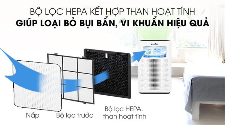 trang bị 4 lớp lọc: lọc bụi thô, lọc Carbon, lọc HEPA, bộ phát ion âm giúp lọc 98.63% bụi bẩn, mầm bệnh gây hại. Cấu tạo màng lọc của máy gồm: - Màng lọc sơ cấp: loại bỏ tạp chất kích thước lớn như bụi bẩn, lông động vậy. - Màng lọc Carbon: hoạt tính loại bỏ các tạp chất kích thước lớn, mùi hôi khó chịu, khói thuốc lá,… - Màng lọc HEPA: loại bỏ 98.63% bụi (kể cả bụi siêu mịn PM 2.5), chất gây dị ứng, phấn hoa. - Bộ phát ion âm: giúp tạo thành phân tử nước trong không khí, giúp trung hòa ion dương có hại trong khói, bụi, vi khuẩn, các thiết bị điện tử, lông động vật,… giúp không khí trong lành hơn.