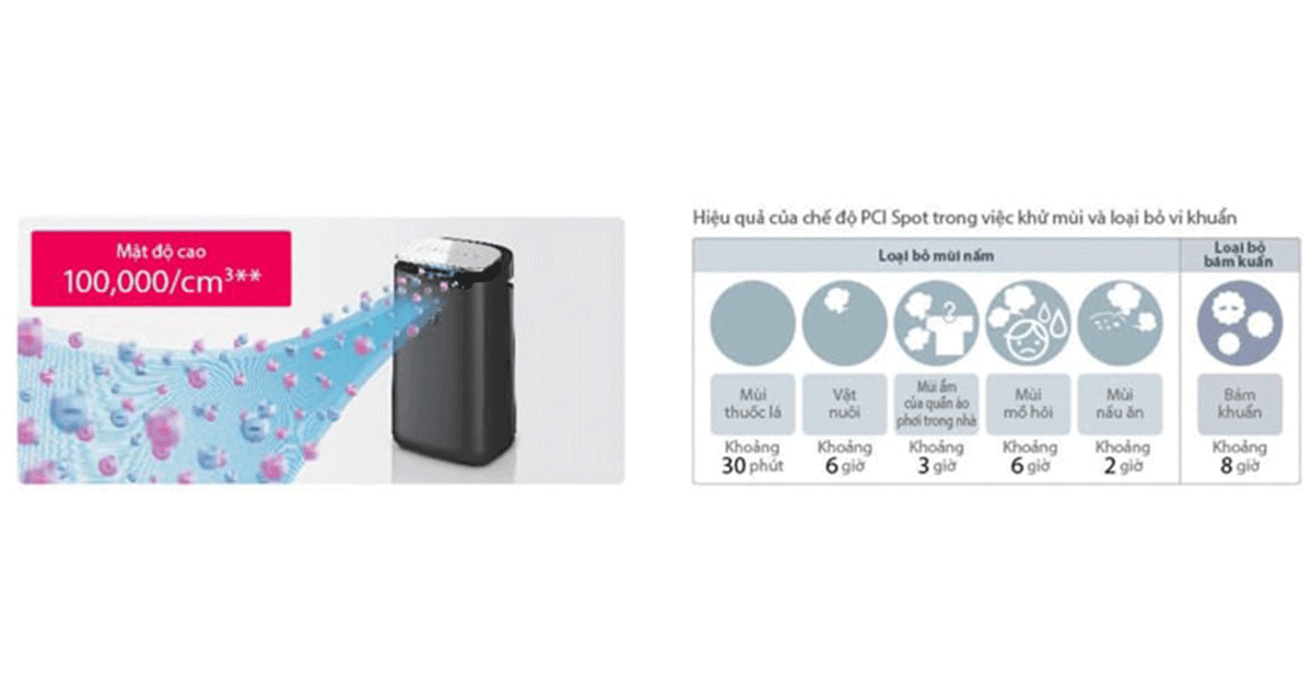 Trong chế độ này, mật độ cao của các Plasmacluster ion được thải ra phía trước. Điều này có hiệu quả trong việc loại bỏ mùi hôi, vi khuẩn và virus bám vào các ngõ ngách của căn phòng.