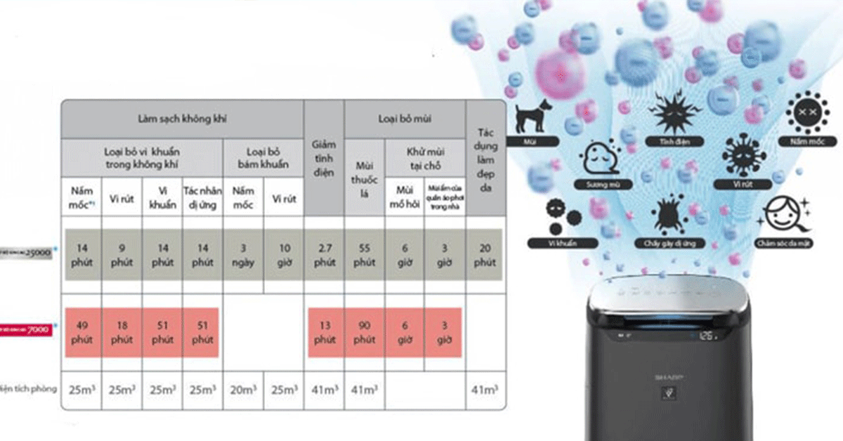 Công nghệ độc quyền Plasmacluster ion trên máy lọc không khí Sharp giúp lọc sạch không khí hiệu quả, mang lại không khí thoải mái trong phòng của bạn. Các ion plasmacluster có thể loại bỏ nấm mốc, vi rút, chất gây dị ứng, mùi khó chịu, Mật độ plasmacluster ion càng cao thì lọc khí càng hiệu quả.
