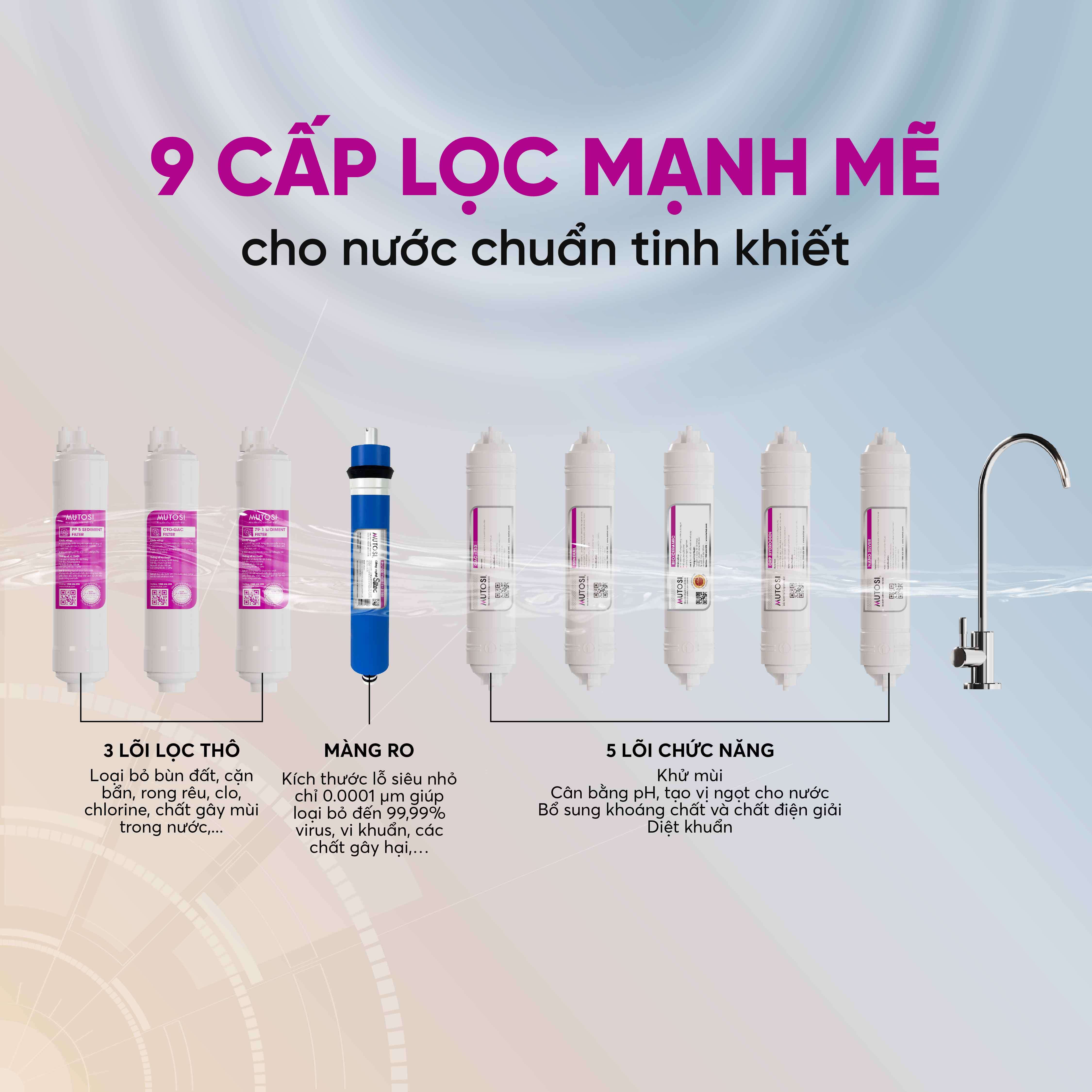 9 cấp lọc mạnh mẽ - Lọc sạch 99,99% tạp chất trong nước