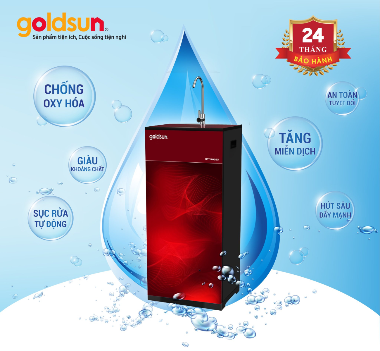 Trước thực trạng nguồn nước sinh hoạt ngày càng ô nhiễm, việc sử dụng máy lọc nước là rất cần thiết để bảo vệ sức khỏe cho tất cả các thành viên trong gia đình. Làm sao để chọn được chiếc máy lọc nước tốt nhất cho gia đình là câu hỏi của rất nhiều người. Hiểu được tâm lý và nhu cầu khách hàng, Goldsun cho ra mắt sản phẩm máy lọc nước Goldsun 10 cấp Hydrogen FA1701(G) sử dụng công nghệ lọc RO hiện đại với 10 cấp lọc công suất lên tới 10L/h không những mang đến nguồn nước tinh khiết mà còn đảm bảo các khoáng chất cần thiết cho sức khỏe.