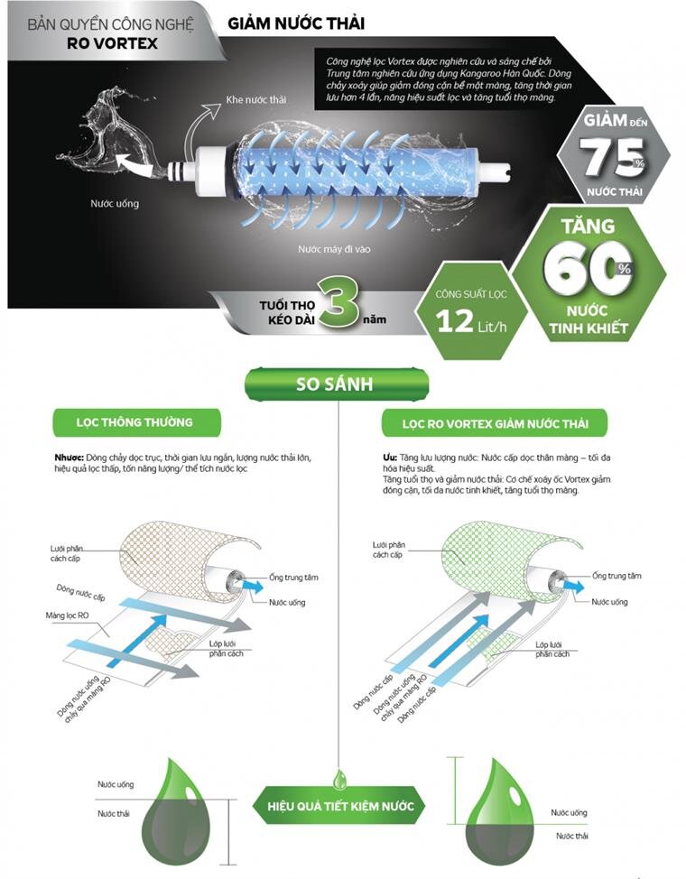 Máy lọc nước Hydrogen Kangaroo KG100HQ là thế hệ máy lọc nước mới với nhiều cải tiến vượt trội như công nghệ lọc Vortex, công nghệ chia tách phân tử nước tự nhiên tạo hydrogen giúp nâng cao sức khỏe của người sử dụng. Máy lọc nước Hydrogen Kangaroo KG100HQ với 9 cấp lọc Lõi lọc 5 Cấu tạo: FIR + Thời gian thay thế: 24 tháng Chức năng: Lõi FIR+ (Far infrảed ray) có tác dụng tương tự bức xạ hồng ngoại. Khi nước đi qua sẽ bổ sung oxy hoạt hóa và giúp phân chia thành phân tử nước nhỏ giúp tăng cường khả năng hấp thu nước trao đổi chất. Lõi lọc sản xuất tại Hàn Quốc. Công suất lọc: 14.000 lít nước. Lõi lọc 6 Cấu tạo: OrpH+ Thời gian thay thế: 12 tháng Chức năng: Lõi khoáng OrpH+ tạo điện giải và hydro hoạt hóa thông qua phương pháp tự nhiên, sử dụng hạt khoáng. Theo nghiên cứu nước điện giải Hydroden giúp phục hồi sức khỏe, hỗ trợ ngăn ngừa hình thành gốc tự do. Lõi lọc sản xuất tại Hàn Quốc Công suất lọc: 7.000 lít nước. Lõi lọc 7 Cấu tạo: HypH+ Thời gian thay thế: 12 tháng Chức năng: Lõi lọc HypH+ tạo kiềm tính cho nước. Nước kiềm tính hỗ trợ cân bằng độ pH và giúp cải thiện bộ máy tiêu hóa. Lõi lọc sản xuất tại Hàn Quốc. Công suất lọc: 7.000 lít nước Lõi lọc 8 Cấu tạo: Mineral+ Thời gian thay thế: 24 tháng Chức năng: Lõi Minera+ cân bằng khoáng chất thiết yếu trong nước như Ca+, Mg+…giúp tạo nguồn nước khỏe. Các khoáng chất giúp duy trì cơ thể khỏe mạnh, hạn chế bệnh tật. Công suất lọc: 14.000 lít nước Lõi lọc 9 Cấu tạo: Nano Carbon+ Thời gian thay thế: 24 tháng Chức năng: Lõi Nano Carbon giúp loại bỏ một số mùi, flo và tạo vị cho nước ngoài ra giúp hạn chế phát sinh vi khuẩn hoăc tái nhiễm khuẩn. Lõi lọc sản xuất tại Hàn Quốc. Công suất lọc: 14.000 lít nước Tại sao nên chọn máy lọc nước Hydrogen Kangaroo KG100HQ? Tiết kiệm nước: công nghệ lọc RO Vortex (được nghiên cứu và sáng chế bởi Trung tâm nghiên cứu ứng dụng Kangaroo Hàn Quốc) tạo dòng chảy xoáy quanh trục giúp giảm đóng cặn bề mặt màng, tăng thời gian lưu hơn 4 lần, giảm đến 75% nước thải, tăng 69% nước tinh khiết, tăng tuổi thọ màng lọc và máy Bơm hút sâu tự động: giải quyết tình trạng cấp nước đầu vào yếu, thích hợp với nhiều địa hình, cấu tạo đường nước khác nhau tại mỗi gia đình, giúp nguồn nước cấp ổn định, đảm bảo lượng trả nước tinh khiết và kéo dài tuổi thọ sản phẩm. Cơ chế tạo Hydrogen và tái khoáng: chia tách phân tử nước tạo độ kiềm, tăng khoáng chất (Ca2+, Mg2+, Na+…) và bổ sung hàm lượng hydrogen giúp trung hòa và hấp thu các gốc tự do. Công nghệ chia tách phân tử nước tự nhiên, tạo vi khoáng tự nhiên cho nguồn nước. Tại Nhật và Hàn Quốc, máy tạo nước giàu hydrogen được coi là một thiết bị y tế gia đình phổ biến. Cút nối tự làm kín: các đường dẫn nước, cút nối trong máy lọc nước Hydrogen Kangaroo KG100HQ sử dụng cơ chế tự làm kín cho phép giảm thiểu tình trạng rò rỉ nước, tuột ống nối do kỹ thuật lắp. Ngoài ra, cơ chế này cũng khiến người sử dụng hoàn toàn có thể tự lắp đặt nhờ cấu tạo rất thông minh.