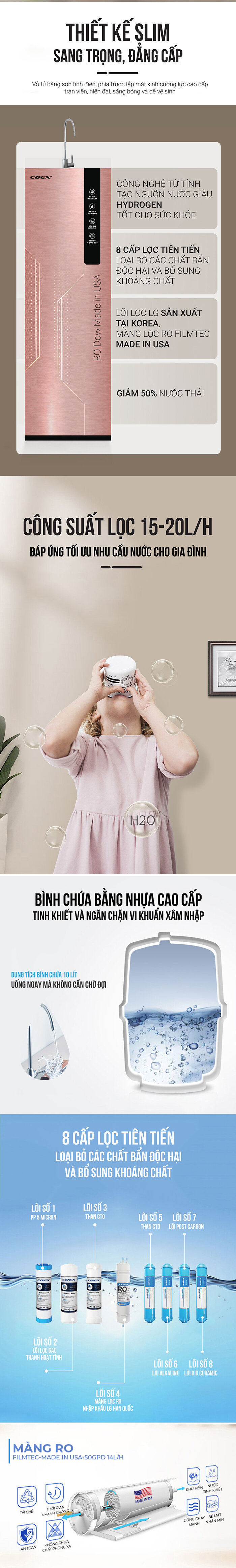 8 cấp lọc tiên tiến loại bỏ các chất bẩn độc hại và bổ sung khoáng chất. Màng lọc RO Filmtec Made in USA, Khử mùi Clo dư, mùi tanh trong nước, Loại bỏ các kim loại nặng, Asen, amoni, mangan, chì, thuốc trừ sâu độc hại, loại bỏ các vi khuẩn, virus gây bệnh... Tăng oxy hòa tan trong nước, chống lão hóa và ngăn ngừa khô da. Nước qua hệ thống lọc hoàn toàn tinh khiết và có thể uống ngay mà không cần đun sôi.