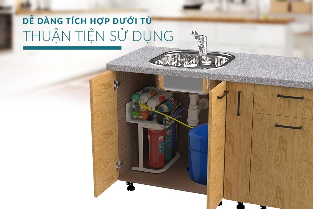 Với thiết kế không vỏ,  dễ dàng tích hợp trong tủ bên dưới bồn rửa tại nhà bếp, giúp hoạt động lấy nước dễ dàng và tiện lợi hơn, đồng thời, tiết kiệm đáng kể chi phí và diện tích cho gia đình.