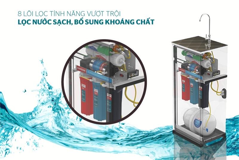 Nhờ trang bị tới 8 lõi lọc, mỗi lõi có 1 công năng riêng biệt nên có khả năng loại bỏ các tạp chất kim loại nặng, độc tố gây ung thư, bệnh đường tiêu hoá, viêm dây thần kinh, thoái hoá cột sống đau lưng,... Loại bỏ vi khuẩn có kích thước lớn hơn ≥ 1µm, bẩn bùn và đất rỉ sét có kích thước ≥ 5µm. Đặc biệt, sản phẩm còn có khả năng hấp thụ cao mùi vị, chất hữu cơ, thuốc trừ sâu, chất diệt côn trùng, Clo dư trong nước.