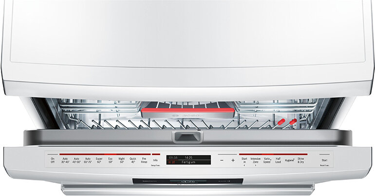 Đồng thời, Bosch SMS88TW02G còn được tích hợp bảng điều khiển cảm ứng Piezo trắng hiện đại. Phông chữ màu trắng tương phản với nền đen, vô cùng dễ nhìn và dễ sử dụng. Bên cạnh đó, bề mặt của máy còn được tích hợp thêm đồng hồ thời gian thực. Đây được xem là điểm khác biệt tuyệt vời so với máy rửa bát độc lập serie 2, 4 và 6 đời cũ vốn thiết kế bảng điều khiển ngay ở mặt trước cửa máy.