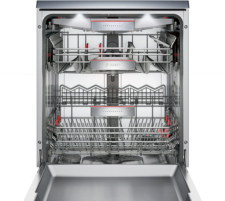 Bosch SMS88TW02G được tích hợp rổ bạc có tay cầm kéo và lớp khảm chống gỉ sét, có độ bền cực kì cao.