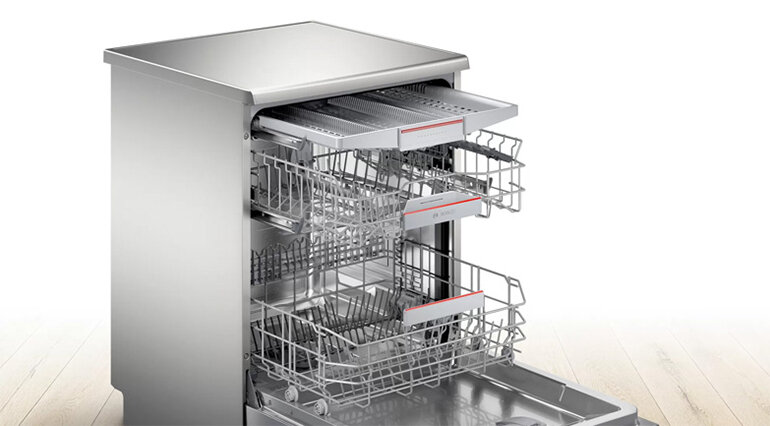 Sản phẩm có hệ thống giàn rửa bao gồm 3 giàn rửa có thể được kéo ra kéo vào rất linh hoạt. Có 2 khay để đựng bát đĩa, nồi chảo, 1 khay đựng đũa nĩa hay các dụng cụ kích thước nhỏ tiện lợi. Ngoài ra, hệ thống điều chỉnh 3 tầng RackMatic, phù hợp với nhu cầu rửa hiện đại ngày nay. Cho phép bạn để giỏ trên ở 3 vị trí khác nhau và có thể dễ dàng thay đổi ngay cả khi rửa đầy tải, làm tăng không gian sử dụng rộng rãi cho rổ dưới.