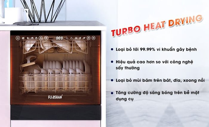 Với tính năng sấy Turbo heart drying (sấy khí nóng), máy rửa bát sẽ giúp sấy khô tốt hơn, loại bỏ mùi bám trên bát, đĩa, xoong nồi, tăng cường độ sáng bóng trên bề mặt dụng cụ, đảm bảo an toàn sức khỏe.