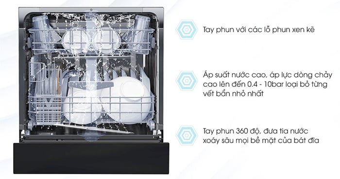 Hệ thống 2 tay phun hiện đại mang lại hiệu quả tốt nhất trên mỗi chu trình làm việc, các lỗ phun xen kẽ, quay 360 độ đưa tia nước xoáy sâu mọi bề mặt của bát đĩa. Áp suất nước cao, áp lực dòng chảy cao lên đến 0.4 - 10bar loại bỏ từng vết bẩn nhỏ nhất.