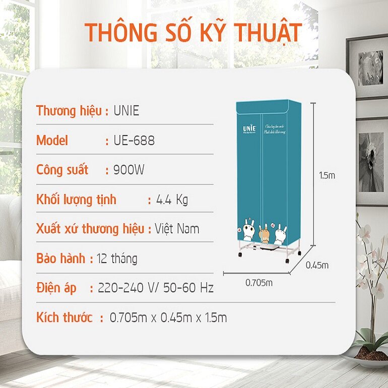 Thời tiết mưa phùn, độ ẩm cao khiến cho quần áo lâu khô và có mùi hôi rất khó chịu. Vì vậy việc trang bị cho gia đình một chiếc máy sấy quần áo UNIE UE-688 là điều rất cần thiết. Quần áo sau khi được vắt kiệt nước bằng máy giặt có thể treo vào khung máy sấy để sấy khô.
