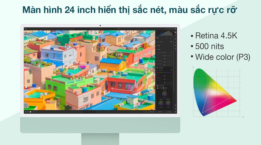 Thưởng thức độ sắc nét, chi tiết rực rỡ trên màn hình Retina 24 inch 4.5K vô cùng sống động. Gam màu rộng P3 mang đến hơn một tỷ màu, thể hiện màu sắc chân thực và phong phú đến không ngờ. Độ sáng lên tới 500 nits cùng lớp phủ chống chói hàng đầu giúp trải nghiệm xem của bạn luôn dễ chịu ở mọi hoàn cảnh.