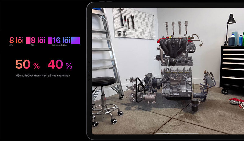 CPU 8 lõi của M1 mang lại hiệu suất nhanh hơn tới 50%. Và M1 có GPU 8 lõi trong một lớp riêng, cung cấp hiệu suất đồ họa nhanh hơn tới 40% cho iPad Pro. Vì vậy, bạn có thể xây dựng các mô hình AR phức tạp, chơi trò chơi với đồ họa chất lượng của bảng điều khiển ở tốc độ khung hình cao, v.v.