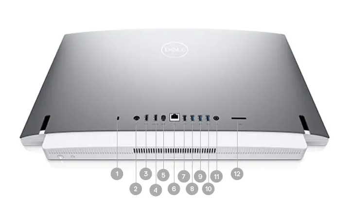 1. Khe khóa bảo mật phía sau | 2. Nguồn DC | 3. Ngõ ra HDMI | 4. Đầu vào HDMI | 5. USB 3.1 Thế hệ 2 Loại C ™ | 6. RJ-45 Ethernet 10/100/1000 | 7. USB 2.0 Loại A | 8. USB 3.1 Thế hệ 1 Loại A | 9.USB 3.1 Thế hệ 1 Loại A | 10. USB 3.1 Thế hệ 1 Loại A | 11. Giắc cắm tai nghe đa năng | 12. Đầu đọc thẻ SD 3.0 Kích cỡ & cân nặng