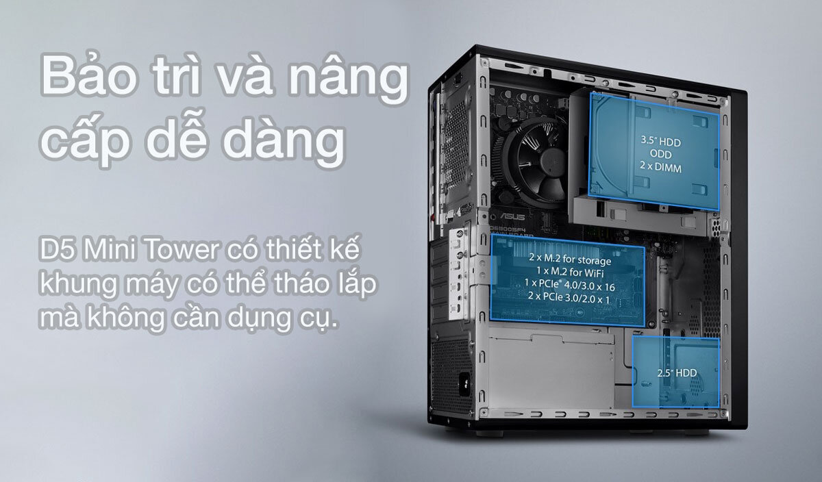 Asus D500ME hỗ trợ khả năng nâng cấp linh hoạt với 2 khe cắm RAM DDR4, cho phép nâng cấp tối đa lên đến 64GB. Ổ cứng bên trong sử dụng chuẩn M.2 NVMe PCIe 4.0 SSD với dung lượng tối đa lên đến 1TB, cùng với ổ cứng HDD 3.5 inch có dung lượng tối đa 2TB. Điều này giúp bạn dễ dàng mở rộng dung lượng lưu trữ và nâng cao hiệu suất làm việc.