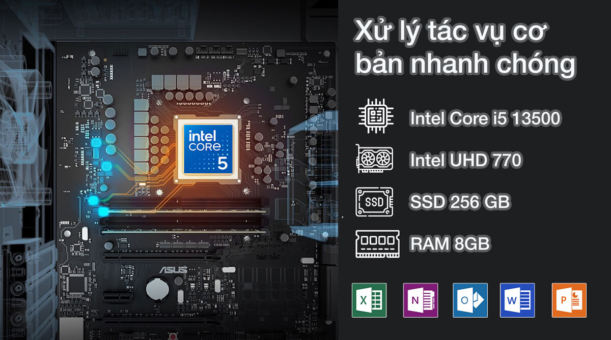 Asus D500ME được trang bị bộ vi xử lý Intel Core i5-13500 với xung nhịp lên đến 4.8GHz và 14 nhân, mang lại hiệu năng vượt trội cho mọi tác vụ. Máy vẫn có thể đáp ứng tốt các ứng dụng văn phòng như Microsoft Office. Ngoài ra, giải pháp lưu trữ SSD 256GB mang đến tốc độ đọc và ghi dữ liệu siêu nhanh, cho phép làm việc hiệu suất và sáng tạo một cách trơn tru, đồng thời có nhiều không gian lưu trữ ảnh và video. Với khả năng nâng cấp RAM DDR4 lên đến 64GB, máy đảm bảo khả năng xử lý đa nhiệm mượt mà và nhanh chóng.