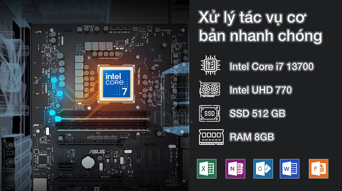 Asus D500ME được trang bị bộ vi xử lý Intel Core i7-13700 với xung nhịp lên đến 5.2GHz và 16 nhân, mang lại hiệu năng vượt trội cho mọi tác vụ. Máy vẫn có thể đáp ứng tốt các ứng dụng văn phòng như Microsoft Office. Ngoài ra, giải pháp lưu trữ SSD 512GB mang đến tốc độ đọc và ghi dữ liệu siêu nhanh, cho phép làm việc hiệu suất và sáng tạo một cách trơn tru, đồng thời có nhiều không gian lưu trữ ảnh và video. Với khả năng nâng cấp RAM DDR4 lên đến 64GB, máy đảm bảo khả năng xử lý đa nhiệm mượt mà và nhanh chóng.