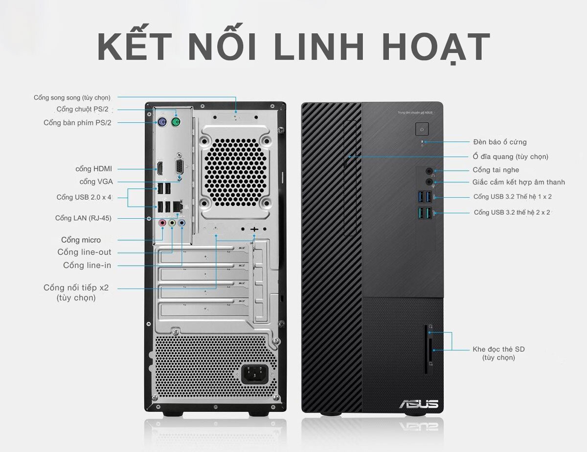 Asus D500ME cung cấp đầy đủ các cổng kết nối tín hiệu, bao gồm cổng USB 3.2 Gen 1 và Gen 2, cổng HDMI, VGA, và cổng Ethernet RJ45. Ngoài ra, máy còn có các cổng âm thanh và khe cắm thẻ nhớ, giúp bạn dễ dàng kết nối với các thiết bị ngoại vi và mở rộng khả năng sử dụng. Với các cổng kết nối đa dạng, Asus D500ME đáp ứng tốt mọi nhu cầu kết nối trong công việc hàng ngày.